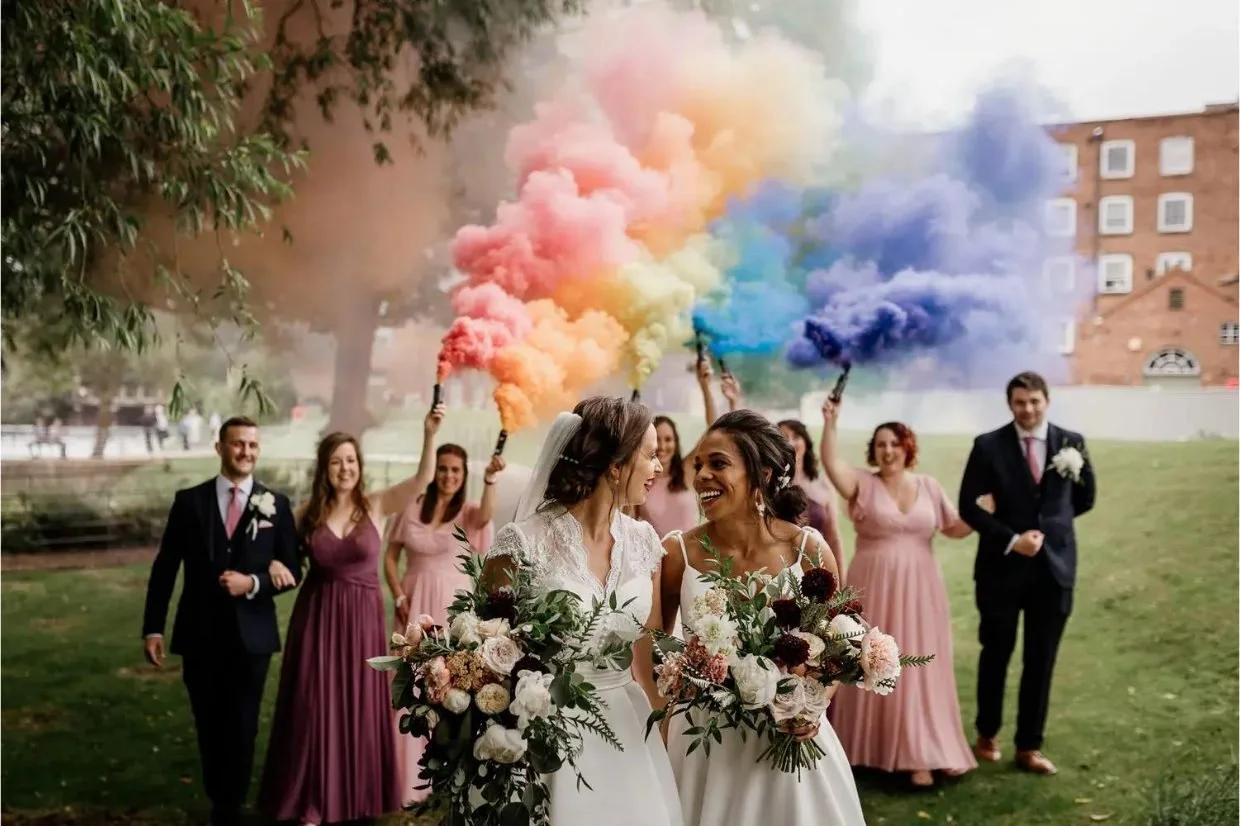 How about coloured smoke bombs for some beautiful, momentous photos? Or stunning pride themed photo backdrops? If you’re a floral fan, go for a stunning handmade backdrop with a selection of real flowers, and shoot some gorgeous portraits in front of it. This would be a big hit with the wedding guests. 🌸🌼 Our wonderful photographers were Mini & Me Photography and Pinky Promise Photography. Seriously recommend checking them out if you’re UK based!