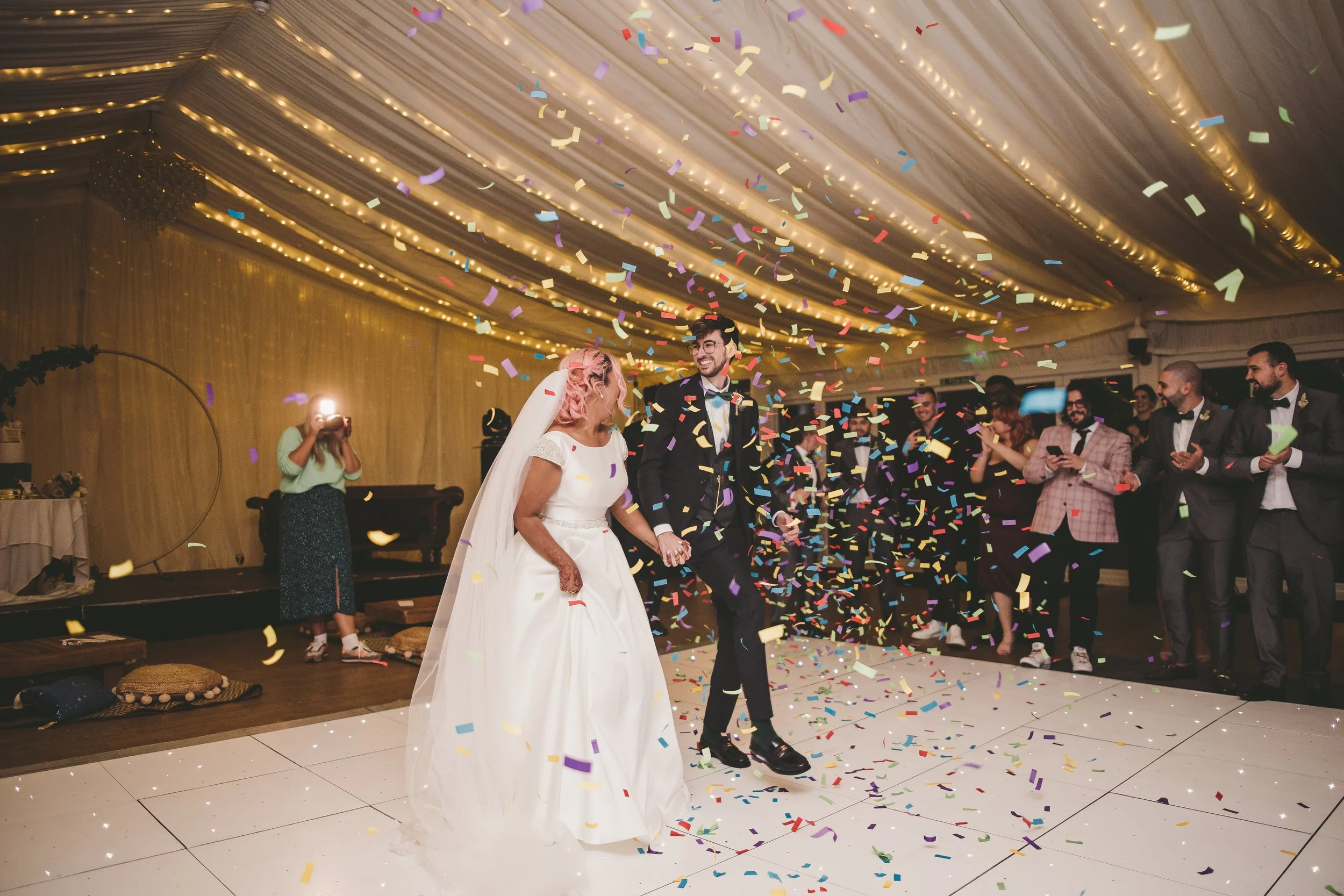 If you want to go for rainbow or particular flag colours, you can achieve this with beautiful bold flowers, centrepieces, napkins, plates, ribbons, custom balloons, confetti and more. For our first dance, we went for a stunning rainbow confetti reveal on the dance floor! 🎉