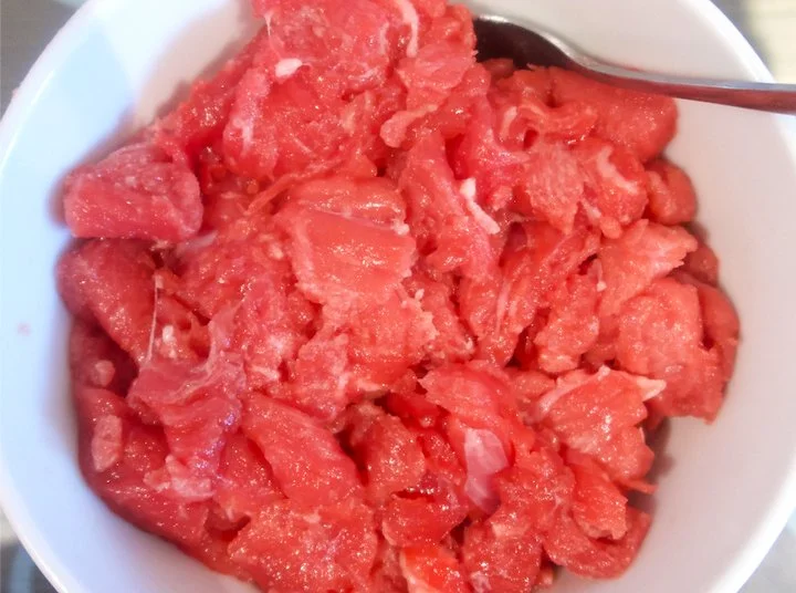 1. Firstly, velvet the meat. Cut it (against the grain if you can) into small bite-sized pieces and mix it thoroughly with 2 heaped teaspoons of bicarbonate of soda. Squish this into a bowl tightly and leave it be for 30 minutes. It'll start to faintly fizz (this means it's working!)